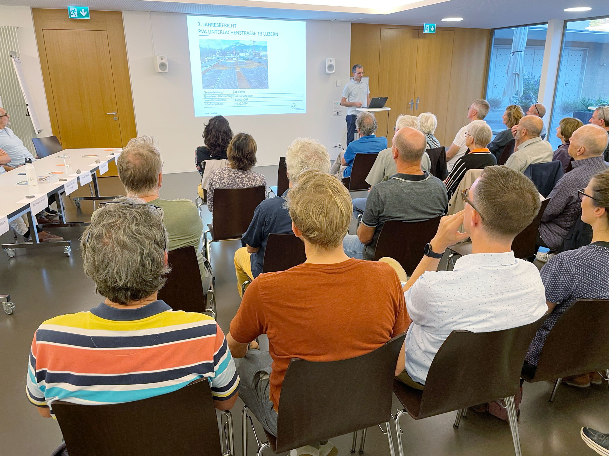 Bereits zum achten Mal waren alle Mitglieder der Energiegenossenschaft Luzern zur jährlichen Generalversammlung und zum anschliessenden Apéro am 18.09.2025 ins Maihof eingeladen. Mit insgesamt 39 Genossenschafterinnen und Genossenschaftern sowie dem Vorstand war dies eine gut besuchte Versammlung.